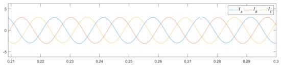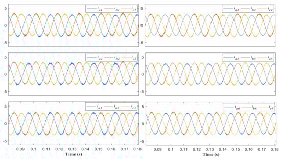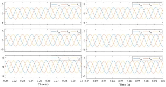 The thirteen-level line-line voltages of the proposed converter (for a modulation index of 1.0 and a switching frequency of 900 Hz) are generated in a steady state, as shown in Figure 5. The voltages are balanced, as demonstrated in (15). It is clear from Figure 5 that the voltage across the load terminals is multistep and, therefore, has low dv/dt and low harmonic content. Figure 6 and Figure 7 show the currents of the VSC modules. Given the configuration of the three-phase converter, the line currents of every VSC module within the converter are symmetrical, thus verifying the relationship in (9). Moreover, the currents inside every VSC module are the same as the output current.