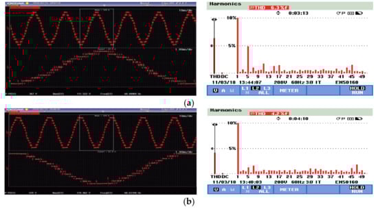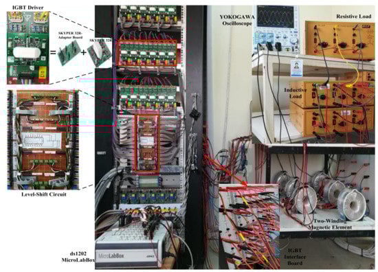 To validate the proposed converter’s good performance, the PS-PWM technique shown in Figure 4 is implemented using a ds1202 MicroLabBox. The fundamental frequency of the reference signal is 60 Hz and the switching frequency is 900 Hz. Figure 9 shows a prototype of the proposed converter. It includes six magnetic elements; 6 two-level, three-phase VSC modules; resistive-inductive loads; and the ds1202-based controller. The block diagram of the PWM control system is shown in Figure 4. The gating signals generated in the ds1202 controller are applied to the IGBT via an isolated driver. In the prototype, SKM75GB12V IGBTs (ratings: 1200 V and 75 A) are used as switching devices. The gate driver SKYPER 32R provides both amplification and isolation from the power circuit. An oscilloscope (YOKOGAWA model no. DLM2054) is used to measure the output voltages. The line currents are measured using a Hall effect current sensor (model no. LTS 25-NP). The currents measured using this sensor are applied to the ADC of the ds1202 board and the resulting measured signals are drawn using the Simulink environment. The experimental parameters are shown in Table 1.
