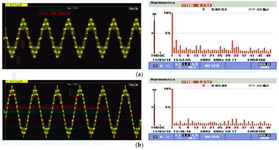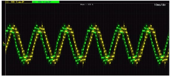 The steady-state experimental results of the proposed converter are presented in Figure 12, Figure 13 and Figure 14. The output terminals of the converter are connected to an inductive and resistive load of 48 Ω resistance and 77 mH inductance and connected in a wye configuration. The thirteen-level line-line voltages of the proposed converter (with a modulation index of 0.95 and a switching frequency of 900 Hz) are shown in Figure 12. As shown in Figure 13 and Figure 14, the line currents of every VSC module within the converter are symmetrical and are the same as the output current, hence verifying the relationships in (9) and the simulation results in Figure 7.
