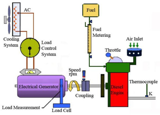 At the beginning of the test, the engine started and worked for 10 min with diesel fuel without applying any load, and then by changing the degree of electrical resistance, thermal elements were placed in the circuit. In this case, the engine is placed under load and its speed dropped slightly and then could be set at the speed of 1500 rpm.