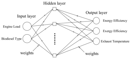 The training process is the important way to achieve a high accuracy from a developed model. The first step was to identify the dependent and independent variables. In this study, fuel type and dynamometer load were considered as independent (input variables) variables and energy efficiency, exergy efficiency and exhaust temperature were considered as dependent variables (output variables). Therefore, by identifying the input and output variables, a MLP type of ANN was employed to develop the target model. As seen in Figure 2, the architecture of these networks generally has three layers which include input, hidden and output layers. Layers are connected by nodes, therefore each layer has its own node. The signal processing begins from first layer.