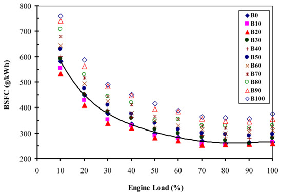 BSFC is presented in Figure 3. The results show that increasing the engine load decreases the BSFC value in the mentioned types of fuel samples. However, when the engine load is in the range of 100% of full load, the engine BSFC is slightly increased; this can be due to the engine reaching its smoke limit. Additionally, the BSFC of fuel samples containing biodiesel was increased compared to pure diesel fuel, because the heating value of biodiesel fuel is lower than that of diesel fuel, but the fuel consumption for the B10 and B20 types is slightly less than for pure diesel fuel due to the better fuel combustion that is consistent with the literature and confirms the studies of other researchers [3,4,5,6,7,8].