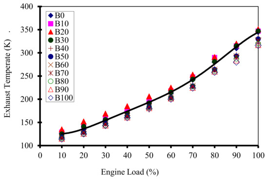 Unlike diesel fuel biodiesel contains oxygen. The oxygen content of fuel increases the outlet gas temperature [43]. On the other hand, the heating value of biodiesel is lower than that for the diesel fuel, so in fuel samples from diesel to B100, the oxygen content rises and the heating value of fuel decreases. Therefore, the effect of oxygen content and lower heating value of biodiesel on exhaust temperature are two contradictory factors.