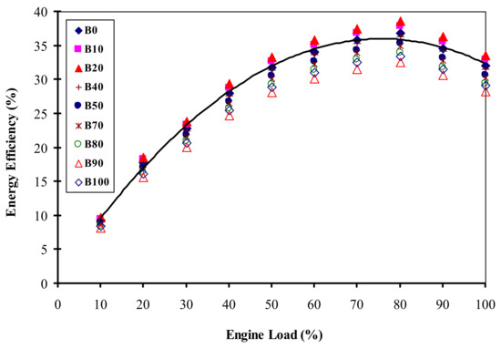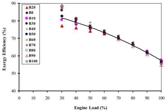 Unlike energy efficiency, exergy efficiency decreased with an increase in engine load for all samples of the blended biodiesel-diesel fuel. Energy efficiency of the engine at loads of 10% and 20% was very low. Under no-load or low-load conditions, fuel was consumed but less thermal energy was converted into mechanical work, thus the achieved value of parameter (which is calculated using energy efficiency) was larger than the compression ratio (5/17) and exergy efficiency was calculated greater than 100%, which is an incorrect result. Therefore, exergy efficiency at 10% and 20% load was not considered in our calculations.