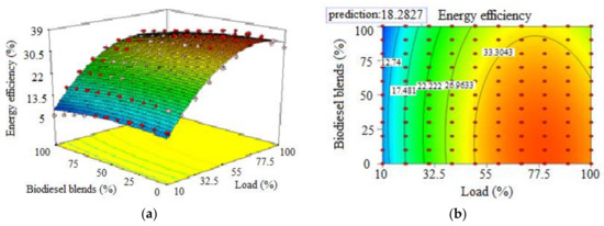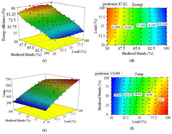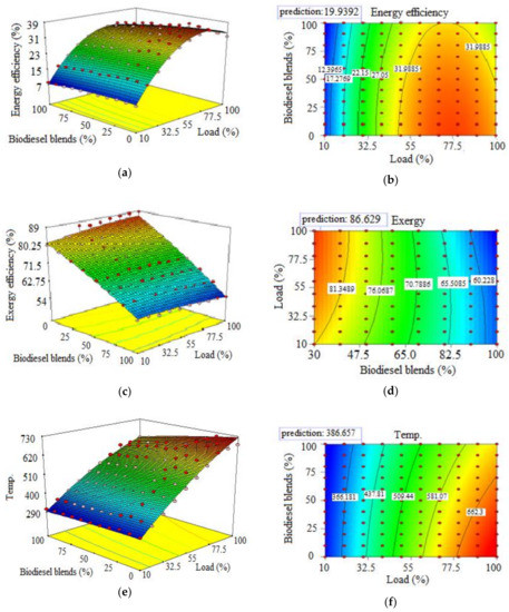 Figure 7 shows the optimal conditions of exergy and energy efficiency based on fuel type and engine load. The Design-Expert® software (Version 8.0, Stat-Ease, Minneapolis, MN, USA) was used to calculate the optimum values of exergy efficiency, energy efficiency and exhaust temperature by biodiesel and engine load. A quadratic method by manual selection was employed to maximize the energy and exergy efficiencies and to minimize the exhaust gas temperatures that are as the main limitations for optimization. Based on Figure 7, the optimum value of energy efficiency, exergy efficiency and exhaust temperature is in range of 25–30 of engine load where the value predicted for energy efficiency by the software is 19.93%. Accordingly, the predicted value of exergy efficiency in this range is 86.629% and the predicted value of exhaust temperature in the calculated range is 386.657 (°C). This means that in fuels containing more biodiesel, the applied load should be in range of 25 to 30% of engine full load.