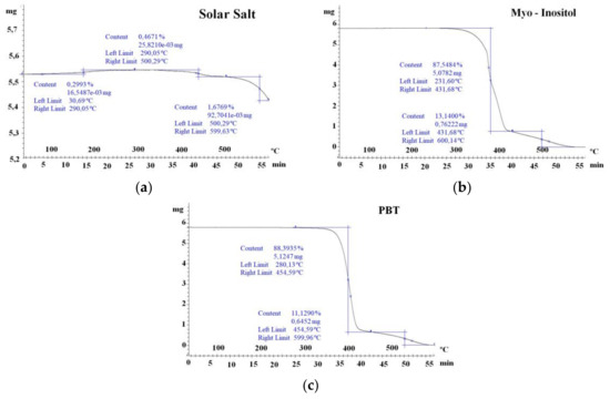 Thermal gravimetric analyses were performed on the two inorganic salts (40 wt % KNO3/60 wt % NaNO3 and NaNO2) and two organic materials (PBT and myo-inositol) shown in Figure 2. Fernández et al. [34] defined as maximum working temperature, the one for which the studied material lost 3% of its initial mass, considered the thermal decomposition starting point. Solar salt TGA results (Figure 2a) show that it starts losing mass at 500 °C. However, as this loss was below 3% no thermal decomposition is considered, making it suitable for the desired final application.