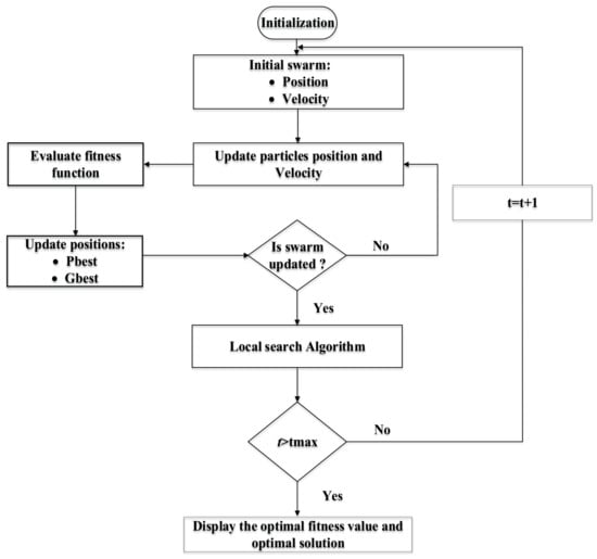 After getting the updated position values of all the particles, if the prearranged meeting condition is not fulfilled the corresponding open facility vectors are resolved with their fitness values to start a new repetition, as the PSO produces a premature and unsatisfactory solution as a result of a rough search. In this regard there is a need to implant a local search algorithm (LSA) into the PSO to produce more satisfactory solutions. At the end of each iteration of the PSO the global best that is found is adopted as the initial solution by the LSA. The Flow chart of CPSO is shown in Figure 2, and the pseudocode of the proposed algorithm (CPSO) is also given above in algorithm 1 [39,40,41].