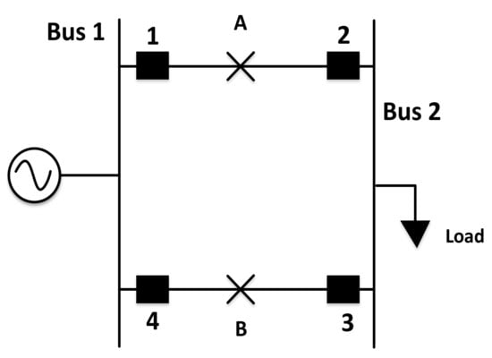 In this case a single end fed system with four overcurrent relay is used, as shown in Figure 3. The relays R1 and R4 are non-directional while relays R2 and R3 have a directional feature. Two faults are taken into consideration: A and B. At bus 2 the maximum load current, including overload, is 600 A. The current transformer (CT) and plug setting ratio for each relay is 300:1 and 1, respectively. The maximum fault current is 4000 A. For each relay the minimum operating time (MOP) is 0.1 s. The primary and backup relation of the relays is shown in Table 1. Table 2 provides the detail of the aρ constant and current seen by the relays for different fault points. In this case the total number of constraints is six; four constraints emerge as a result of the boundaries of the relay operation and two constraints emerge as a result of the coordination condition. The TMS range is 0.025–1.2. The CTI is 0.3 s. The TMSs of all four relays are x1–x4. The optimal operations of the relays obtained by the proposed algorithm are given in Table 3, which also provides the comparative results of the proposed algorithm with a previously published algorithm described in the literature. According to Table 3, the proposed algorithm is a better solution for the current case.