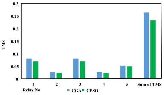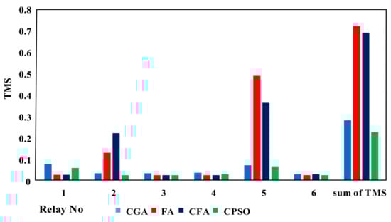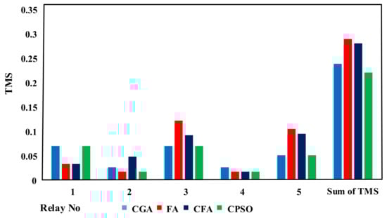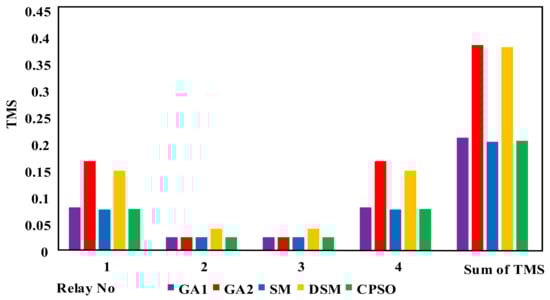 The objective function was solved using a continuous particle swarm algorithm. In each case study the number of iterations and population size are both taken to be 300, the minimum and maximum inertia weights are 0.4 and 0.9, and the acceleration factor (c1, c2) is 2. In addition, r1 and r2 are between [0, 1]. As can be seen in Table 3, the proposed method works and it performs better as compared to other evolutionary techniques. The proposed algorithm gives an optimal solution and lower total operating time and can solve the overcurrent relay problem faster and in a superior way. The values of the TMSs obtained are found to satisfy all the constraints. They give the minimum operating time of the relays for any fault location and also ensure proper coordination. Figure 4 depicts the graphical representation of the optimized Time Multiplier Setting in the literature.
