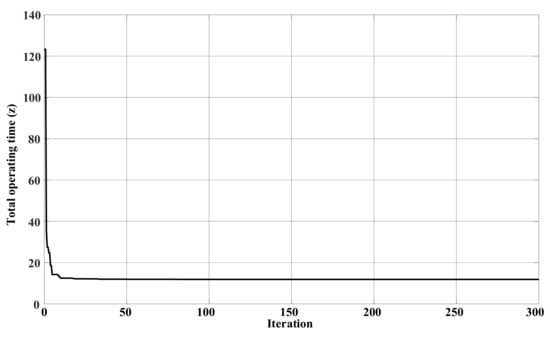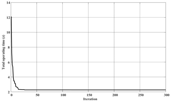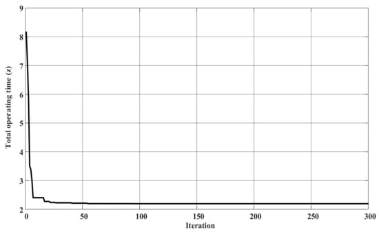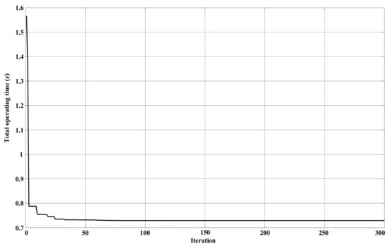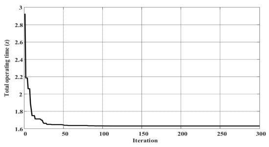 The convergence characteristic graph for the total operating time (TOP) obtained for Case 1 during the simulation is shown in Figure 5, demonstrating that the convergence is faster and achieved a better value for the objective function (z) in fewer iterations. The total net gain in time achieved by the proposed algorithm is shown in Table 4, which demonstrates the superiority and advantages of CPSO over the techniques mentioned in the literature.