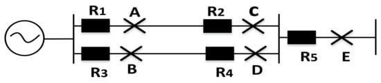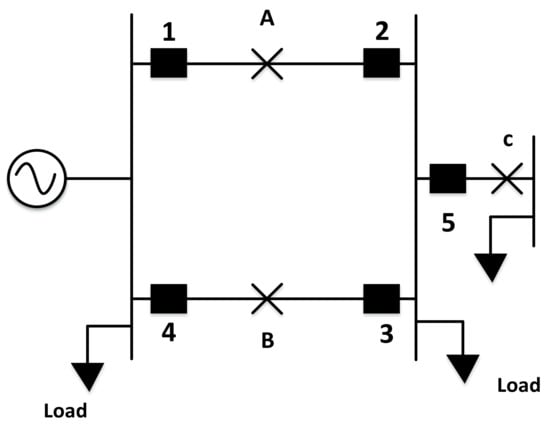 A parallel distribution system that is fed from a single end with five overcurrent relays is shown in Figure 9. The current transfer ratio and plug setting of the relays are assumed to be 300:1 and 1, respectively. Two fault currents are imposed in the middle of the lines, i.e., A and B. For the fault at A backup protection will be provided by relay R3 to relay R2 while for the fault at B the backup will be provided by relay R1 to R4, and for the fault at C back up will be provided by R1, R3 to R5. In this case, the total number of constraints is nine; five constraints arise as a result of the boundaries of the relay operation and four constraints emerge as a result of the coordination condition. The MOP of each relay is 0.1 s. The CTI is 0.2 s. The TMSs of all the relays is x1–x5. The currents seen by the relays and constants for different fault locations are given in Table 10.