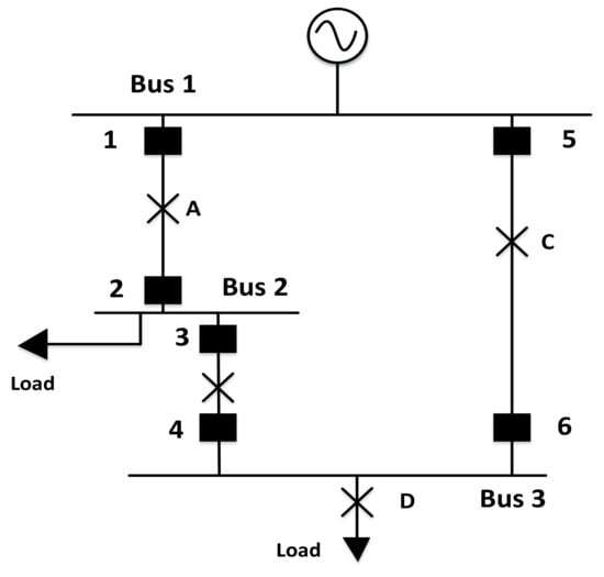 In this case, a multi-loop system with six overcurrent relays and with negligible line charging admittances is considered, as shown in Figure 13. A set of various primary and backup relays are designed which are subject to the locations of the various faults. These configurations are contingent on the path of the fault current in the different feeders. The line data of the system are shown in Table 13. Four different fault positions are considered. The primary and backup relationships of the relays for the four fault points are given in Table 14. The CT ratios and plug setting are illustrated in Table 15. The constants currents seen by the relays for the different fault locations are given in Table 16. In this case study the total number of constraints is eleven; six constraints emerge as a result of the boundaries of the relay operation and five constraints emerge as a result of the coordination condition. The MOP of each relay is 0.1, while the range of the TMS is 0.025–1.2, except x1 which is 0.027. The CTI is 0.3 s. The TMSs of all six relays are x1–x6. The optimal operation of the relays as achieved by the proposed algorithm is given in Table 17, which also provides the comparative results of the proposed algorithm with a previous optimization algorithm explained in the literature. According to Table 18, the proposed algorithm achieves a better solution for this case.