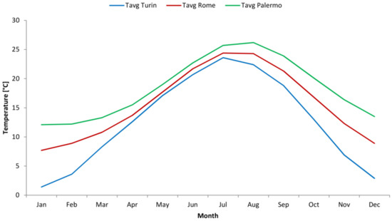 In order to demonstrate the effect of temperature-dependent thermal conductivity, simulations were run in three different Italian climate conditions corresponding to three cities: Turin (northern Italy), Rome (central Italy), and Palermo (southern Italy). According to Köppen climate classification [42], Turin has a humid temperate climate, classified as Cfa, with cold, foggy winters and hot summers; Rome has a warm temperate climate, classified as Csa, with warm winters and hot summers; and Palermo has a semi-arid climate, classified as BSk, with moderately cold winters and hot and dry summers. Figure 1 depicts the average monthly temperature trends.