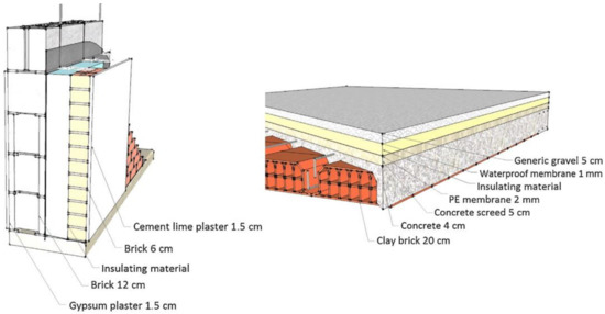 Type of construction components simulated, brick-cavity structure for walls (on the left), hollow brick–cement structure for flat roofs (on the right).