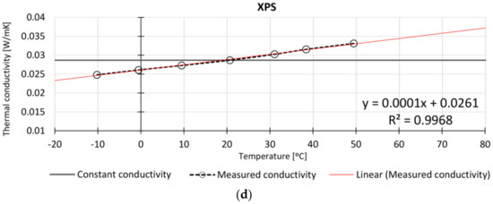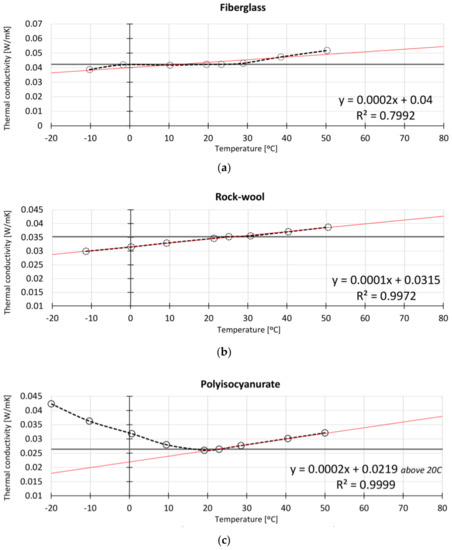 Conductivities were measured experimentally multiple times in the range from −20 °C to +60 °C and the final results of the test are reported in Figure 3; data points are between −10 °C and +50 °C for all materials except for polyisocyanurate, for which the nonlinear behavior is reported up to −20 °C. The trend lines, supported by the equation reported in the legend, depict the data behavior of materials. It is noteworthy that the thermal conductivity values for rockwool, fiberglass, and extruded polystyrene (XPS) are nearly linear with respect to temperature while polyisocyanurate exhibits a nonlinear behavior with higher conductivity values for colder temperatures. In particular, the deviation from linear behavior begins at 20 °C and the main change is reached around 10 °C; this is when the blowing agent within the polyisocyanurate microstructure starts condensing, determining the rise of conductivity. This effect has recently been extensively discussed by Berardi and Naldi [44].