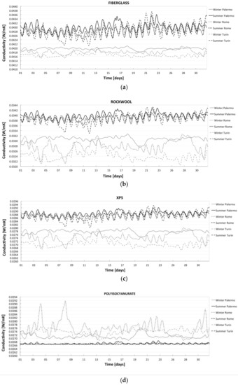 Figure 4 and Figure 5 present the data results for vertical walls and flat roofs, respectively, and are organized by material for each location. The thermal conductivities of exterior walls with fiberglass, rockwool, and extruded polystyrene (XPS) insulation in Figure 4 exhibit better performance at lower temperatures, as shown in the winter time series for Turin and Palermo. They represent the two extreme conditions, Turin corresponding to northern Italy and Palermo to southern Italy. On the contrary, polyisocyanurate (PIR) conductivity increases at lower temperatures with a nonlinear trend. The deviation from linear temperature dependence begins at 20 °C and the value remains nearly constant up to 10 °C. This fact depends on the gas condensation process inside the polyisocyanurate when temperature falls below 10 °C, as explained before. The case of Rome in winter presents a larger variability because of the combination of low temperatures with high solar radiation that determines larger oscillations.