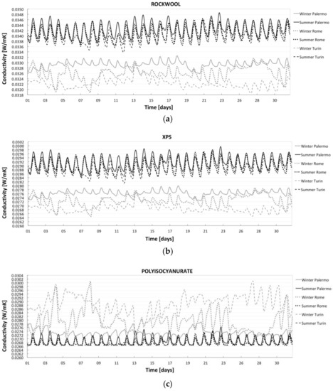 Fiberglass is not considered for roof insulation because it is not a suitable material for flat roof components. Analyzing the plots relative to flat roofs in Figure 5, we can see how simulations confirm the different behavior of polyisocyanurate with respect to the other insulation materials—rockwool and XPS. What appears to be evident from Figure 1 is the fact that temperatures in Turin are much lower in winter then those in Rome and Palermo and are below 10 °C, the point of condensation of the blowing agent in the polyisocyanurate. Again, Rome in winter presents larger conductivity oscillations because of the combination of low temperatures with high solar radiation.