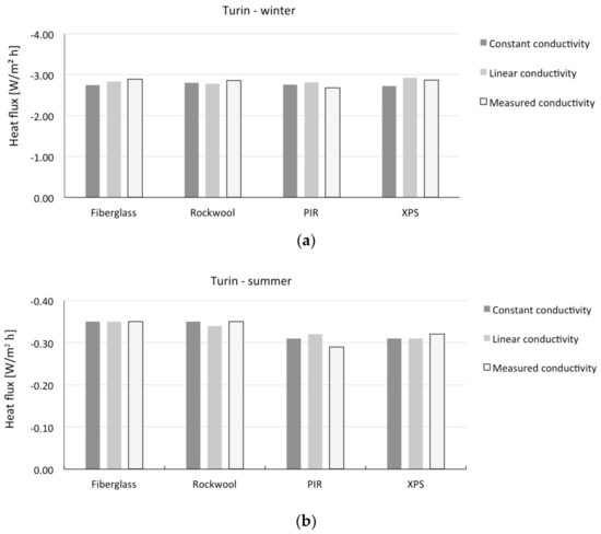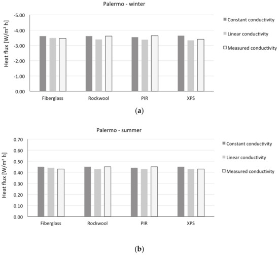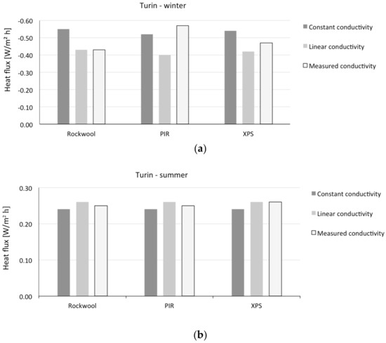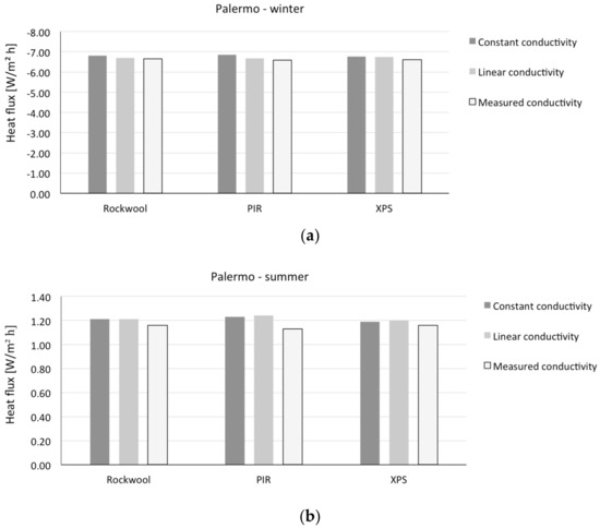 A positive value of the percentage difference indicates that the heat flux obtained from simulations with experimentally measured conductivity is higher, in absolute value, than the one obtained with either constant or linear assumptions. This implies that in the winter period an underestimation of heat losses and, consequently, an underestimation of thermal demand for heating flux is negative in all cases. On the other hand, the summer results depend on the sign of the heat flux: when the heat flux is negative, a negative percentage difference implies an underestimation of heat losses (e.g., external walls for Turin) or, vice versa, an underestimation of gains when the heat flux is positive (e.g., external walls for Palermo, horizontal roofs for Turin and Palermo). The differences found by means of simulation remain in most of the cases lower than 10% in absolute value. The higher values encountered are for polyisocyanurate (PIR) and extruded polystyrene (XPS) in the flat roof in Turin for winter conditions, when comparing linear temperature dependence with respect to measured. The percentage differences in these cases are respectively 42.5% and 12%. Therefore, we can state that for the cases considered, most of the time a sensitivity analysis assuming constant thermal conductivity would be sufficient to address the issue of accounting for performance variability. This implies the possibility of using conventional simulation tools, although considering a spectrum of input data variability. Clearly, in order to be able to derive general conclusions (e.g., practical indications for sensitivity analyses using conventional stationary and dynamic simulation tools), more extensive experimental and simulation analysis would be necessary, employing statistical reference buildings [48].