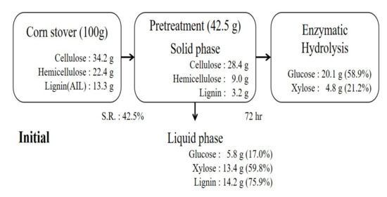 The pretreated corn stover was hydrolyzed in Erlenmeyer flasks. The saccharification test using enzyme were performed in a 0.1 M citrate buffer solution (pH 4.8) shaken at 150 rpm for 72 h. The conditions of enzymatic digestion were substrate (treated solid) concentration of 2.0 wt % in 100 mL working volume, temperature of 50 °C, and enzyme loading of 60 FPU/g of treated solid. The enzymatic digestibilities of glucan and xylan were calculated as [17]