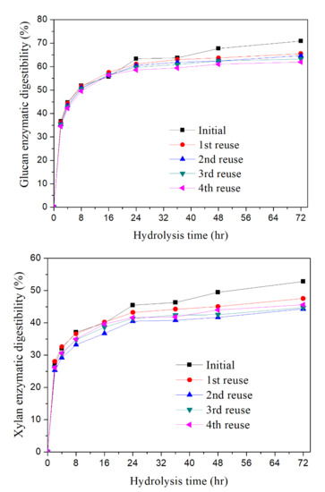 Enzymatic digestibility of pretreated corn stover by reused organosolv.
