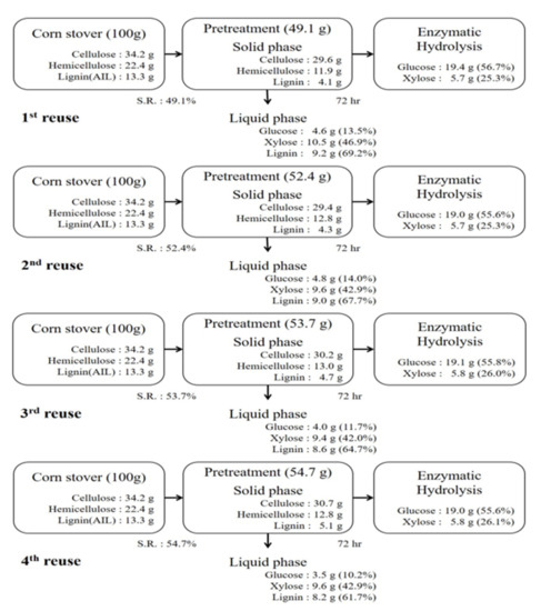 The results of enzymatic hydrolysis of pretreated biomass by reused organosolv were expressed as mass balance from the initial biomass, as is shown in Figure 4. Although organosolv use was repeated, glucose production per 100 g of biomass was about 19 g, which was 56% conversion. In addition, xylose production was 5.8 g, 26% conversion. Meantime, the use of organosolv was repeated, and the solid remaining increased, but the glucan and xylan digestibilities decreased. It was estimated that the production of biomass was maintained because of this phenomenon. Thus, it is predicted that even if the organosolv were used repeatedly, the yield would not change significantly. Certainly, there is a limit to the repeated use of organosolv. However, even if we have not investigated that threshold, it can be concluded that these results provide sufficient conditions for this application as a water saving process model in the pretreatment process. Therefore, the organosolv can be reused in the water saving pretreatment model.