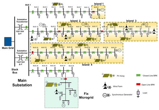 Due to the high penetration of RES in distribution systems, islanded operation mode for DG units are considered by many utility providers as a suitable approach to maintain continuity and reliability of supply. However, as faults can occur at any point in a distribution system, the configuration of the active subsections formed is unpredictable. As shown in Figure 1, there are several possibilities to form islands via opening breakers BK1-BK37. The identification of the island configuration is one of the important requirements for the power system analysis. Moreover, in order to stabilize the system and to conduct a voltage stability study, it is important to detect new system configuration(s) immediately after removing the faulty section. Furthermore, the new topology of the system is vital for triggering the self-healing scenarios including load and generator tripping, generation controls, intentional islanding and system reconfiguration.