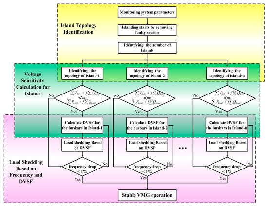 Weak bus-bars are chosen based on the dynamic voltage sensitivity factor. In order to conform to IEEE-1547 standard, after the first round of load shedding, if the system frequency division exceeds the ±1% of its rating, further load shedding will be done at the next weak bus-bar based on the new DVSF. This procedure is repeated until a stable operation point for all islands is gained. A flowchart of the proposed algorithm is depicted in Figure 3.
