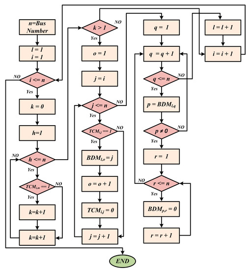 Once the node integration matrix is calculated, the topology Connection Matrix [TCM]n,n is carried out. The topology connection matrix represents the subsections and the vertices in each subsection. The flowchart to calculate the [TCM] is depicted in Figure 5. Like the node integration matrix, [TCM] is a square matrix and the number of rows and columns depends on the number of vertices. The [NIM] is utilized to determine all routes in the system. The steps of determining the subsection is as follows: