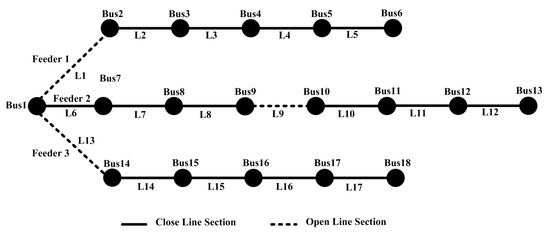 In order to form the node integration matrix [NIM], the system topology was monitored using current measurements. The line section with none zero current was considered as a closed line. Using the procedure explained in Section 2, the calculated [TCM]18×18 is shown in Equation (14) for the test distribution network. To extract the number of bus-bars and corresponding Islands, the procedure, which is depicted in Figure 6, was applied on the calculated topology connection matrix. The calculated topology matrix [TCM] for the test network is shown in Equation (14):