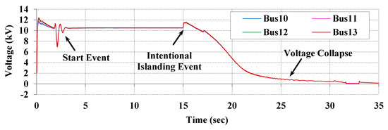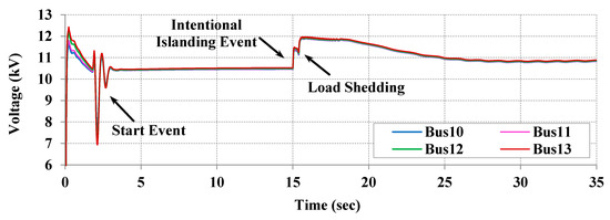For the new topology, there is 1.82 MW of excess load in island-2. Thus, according to the previous section, Bus13 as the weakest bus-bar and Bus10 as the second weakest bus-bar were chosen to perform the load shedding. The results for the bus-bar voltages are shown in Figure 14. As seen in this figure, the bus-bar voltages decreases after islanding. However, the load shedding prevents the voltage collapse in the island and all the bus-bar voltages recover to the acceptable range.
