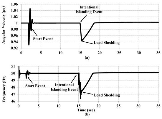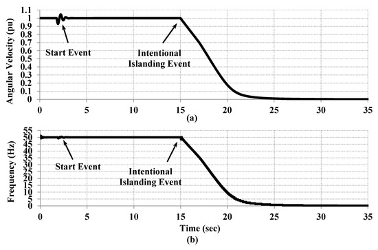 Synchronous generator speed and frequency of the system are shown in Figure 15a,b.