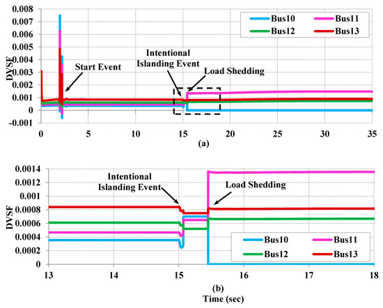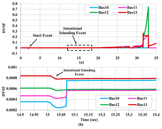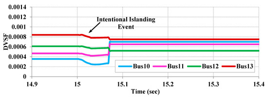 The full window of the calculated conventional voltage sensitivity index using pre-islanding data is shown in Figure 12a and the expanded window during the islanding is demonstrated in Figure 12b. With reference to the results, the most stable bus-bar is Bus11, since it has the lowest sensitivity index and the most sensitive bus-bar is Bus13. Hence, according to results calculated using conventional method, load-shedding program should start with Bus13 by virtue of being the weakest bus-bar and proceed to Bus10, 12 and 11. However, in the proposed scheme, once islanding occurs, the new system topology is used to calculate the DVSF. The calculated DVSF for Island-2 is illustrated in Figure 13. According to these results, once islanding takes place, the sensitivity of Bus13 is higher compared to the other bus-bars. Hence, it can be concluded that Bus13 is still the weakest bus-bar followed by Bus10, Bus11 and Bus12.