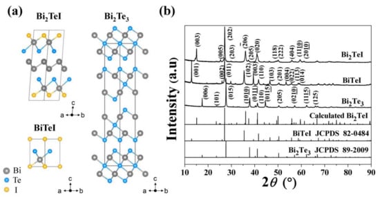 (a) Crystal structures of Bi2TeI, BiTeI, and Bi2Te3. (b) Powder XRD patterns of Bi2TeI, BiTeI, and Bi2Te3 synthesized by a combination of melting, annealing, and spark plasma sintering techniques.