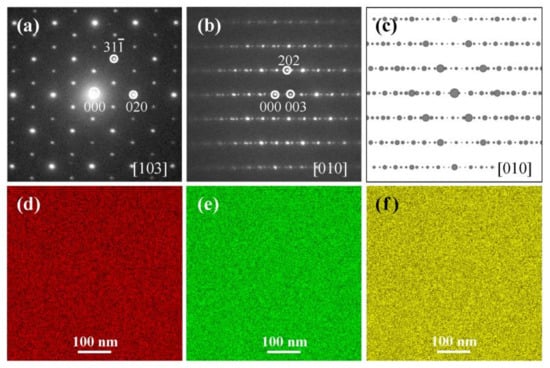 Differently to Bi2Te3 and BiTeI, experimental study performed on Bi2TeI was rare since the preparation of Bi2TeI was a challenge [,,]. It has been reported that phase-pure Bi2TeI could not be obtained by long-term annealing, gas phase reaction, or slow cooling [,,,]. As guided with the solid-state equilibria of Bi-Te-I systems [,,], polycrystalline Bi2TeI bulk samples were synthesized using a combination of melting, annealing, and SPS techniques in this work. This combined approach has been widely used for preparing varioustable TE materials [,]. Figure 1b shows the powder XRD patterns of Bi2Te3, BiTeI, and Bi2TeI. All the diffraction peaks can be indexed to the standard files of the Joint Committee on Powder Diffraction Standards (JCPDS) 89-2009 of Bi2Te3 and the JCPDS 82-0484 of BiTeI, respectively. The XRD pattern of Bi2TeI was calculated with the reported monoclinic structure []. All the diffraction peaks can be indexed to the calculated pattern, indicating that the synthesized Bi2TeI was single-phase. Figure 2a,b shows the SAED patterns taken on Bi2TeI sample. The SAED patterns of Bi2TeI can be indexed as [103] and [010] zone axis of the monoclinic crystal structure. The layered structure can be reflected from the SAED pattern along the [010] zone axis, which shows good agreement between the experiment and simulation results. Some diffraction points that were not observed indicated the existence of intrinsic defects in the sample. Figure 2d–f shows the elemental mapping of Bi, Te, and I on Bi2TeI FIB sample. It can be seen that the elements were uniformly distributed in the nanometre scale, indicating the good homogeneity of Bi2TeI samples.