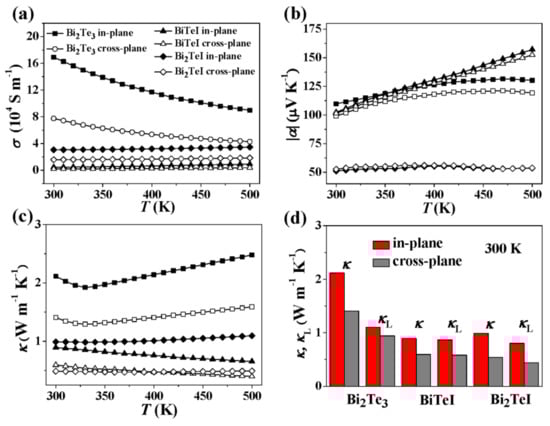 Figure 3 shows the temperature dependence of transport properties of Bi2Te3, BiTeI, and Bi2TeI, including electrical conductivity, absolute Seebeck coefficient, and thermal conductivities measured along the in-plane and cross-plane directions. The charge transport properties at 300 K including carrier concentration and Hall mobility along the two directions are listed in Table 1. Along the two mutually perpendicular directions, the anisotropy in σ was large for Bi2Te3 and BiTeI but in α was small. The anisotropy in layered compounds is determined by the highly anisotropic mobility. σ of Bi2Te3 decreased with the increase in temperature, indicating a heavily doped semiconducting transport behavior. BiTeI and Bi2TeI had σ increased with the increase in temperature, showing a semiconducting transport behavior. Bi2Te3 and BiTeI were n-type while Bi2TeI was p-type. The absolute α of BiTeI was around 100 μV K−1 at 300 K and increased with the increase temperature from 300 to 500 K, which is consistent with the reported work []. Bi2TeI had lower α values as compared with BiTeI, which might be related to the higher carrier concentration and much smaller band gap of Bi2TeI (0.1 eV for Bi2TeI [] and 0.38 eV for BiTeI []).