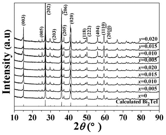 Phase constituents were determined by X-ray diffraction (XRD, PANalytical X’Pert PRO, PANalytical, Almelo, The Netherlands) using Cu Kα radiation. The microstructure and chemical compositions were analyzed by an electron probe micro-analyzer (EPMA, JXA-8230, JEOL, Tokyo, Japan). Selected area electron diffraction (SAED) and elemental mapping of Bi2TeI were performed with transmission electron microscopy (TEM, Talos F200S, Thermo Fisher Scientific, Waltham, MA, USA) equipped with energy dispersion X-ray spectroscopy (EDX). Scanning transmission electron microscopy–energy dispersion X-ray spectroscopy (STEM-EDX) mode was used to capture the elemental distribution in the nanometre scale. The TEM sample for SAED and STEM-EDX analysis was made by a focused ion beam (FIB, Helios NanoLab G3 UC, Thermo Fisher Scientific). σ and α were measured with the standard four-probe method (ZEM-3, ULVAC Technologies, Inc., Kanagawa, Japan) in a He atmosphere. Hall effect measurements were performed on a commercial testing system (Thermoelectric and magnetic performance of multilayer film materials, NYMS-1, Shanghai, China) []. The measurements were performed in a He atmosphere with a maximum applied magnetic field of 1.5 T. κ was calculated using the equation κ = Cpλρ0, where Cp is the specific heat capacity, ρ0 is the bulk density, and λ is the thermal diffusion coefficient. λ was measured by a laser flash technique (Netzsch LFA 457, Selb, Germany) in a flowing Ar atmosphere. ρ0 was measured by the Archimedes method. Uncertainties for σ and κ were ±5–7%, and for α was ±5%. Since these layered compounds sintered by the SPS technique exhibited strong c-axis preferred orientation along the direction of pressure, the TE transport properties along the in-plane (perpendicular to the direction of pressure) and cross-plane (parallel to the direction of pressure) directions were separately measured.