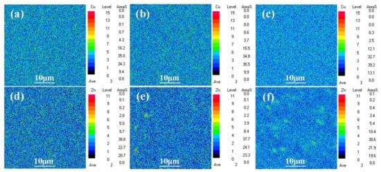 Elemental mapping of (a–c) Cu on CuxBi2TeI and (d–f) Zn on ZnyBi2TeI samples. (a) x = 1%, (b) x = 1.5%, (c) x = 2%, (d) y = 1%, (e) y = 1.5%, (f) y = 2%.