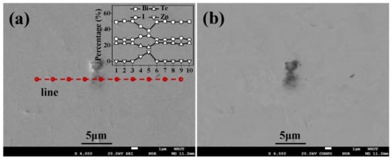 (a) Secondary electron image and (b) backscattered electron image of a large Zn-rich area on Zn0.015Bi2TeI sample. The elemental distribution along the line marked in (a) is also presented.