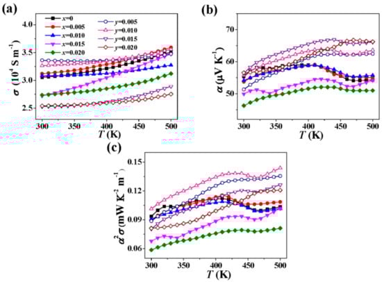 Figure 7 shows the temperature dependence of in-plane electrical conductivity, Seebeck coefficient, and power factor of Cu- and Zn-doped Bi2TeI. The in-plane charge transport properties of Cu-doped CuxBi2TeI and Zn-doped ZnyBi2TeI at 300 K are listed in Table 2. σ of the doped samples was increased slowly while increasing the temperature, indicating a semiconducting transport behavior. Doping Bi2TeI with 1.5% and 2% Cu led to decreased σ. With increasing the Zn content, σ of ZnyBi2TeI was first increased then largely decreased. The decrease in σ upon doping with large amount of Cu should be attributed to the decreased carrier concentration. After doping with Zn, the carrier concentration was greatly increased, from 8.1 × 1020 cm−3 for the pristine Bi2TeI to 1.48 × 1021 cm−3 for Zn0.01Bi2TeI, and kept almost unchanged after doping with 2% Zn. Therefore, the increase in σ for Zn0.01Bi2TeI was due to the increased carrier concentration, and the decrease in σ for Zn0.015Bi2TeI and Zn0.02Bi2TeI might be related to the formation of nonconductive ZnI2 impurity phase. Since the carrier concentration was reduced after Cu doping, it can be inferred that Cu as an intercalated dopant has entered into the interlayer space of Bi2TeI. The electron donor behavior of the intercalated Cu has been reported in other layered compounds [,]. For Zn doped samples, a substitution of Zn2+ on Bi3+ sites might be accounted for the increased carrier concentration of the p-type materials.