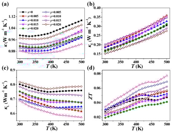Figure 8 shows the temperature dependence of in-plane thermal conductivity, carrier thermal conductivity, and lattice thermal conductivity of Cu-doped and Zn-doped Bi2TeI. With an increase in temperature from 300 to 500 K, κ first decreased slightly and then increased gradually. The first decrease in κ was related to the phonon–phonon scattering and the increase at higher temperatures should be mainly due to the contribution of κE. The κL values for all the samples decreased with the increase in temperature, reflecting strong phonon–phonon scattering in the layered Bi2TeI. With the increase in the doping content of Cu and Zn, the κL values first decreased and then increased. The first decrease in κL values with doping Cu might originate from the point defect scattering and disorder scattering of the intercalated Cu. The increase in κL values after doping more Cu should be related to the enhanced interlayer coupling between QSH and NI layers in these kinds of layered materials. It was inferred that the intercalation of dopants could lead to increased sound velocity and Debye temperature along the cross-plane directions, which leads to higher κL. The first decrease in κL values after doping with Zn should originate from the improved point defect scattering when the dopant Zn substituted for the Bi sites. The increase in κL values after doping more Zn should be attributed to the presence of ZnI2 impurity. Zn0.01Bi2TeI had the lowest in-plane lattice thermal conductivity with 0.69 W m−1 K−1 at 300 K and 0.58 W m−1 K−1 at 500 K.