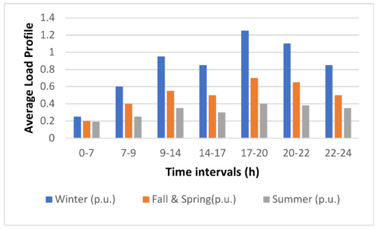 Most of the loads in a power network vary with time. In addition to the daily variation of loads, the load profile also depends on the seasons and weather conditions during a year. Thus, the daily load profile should be considered variable for each season of a year. As the weather condition does not change that much in a season, the load demand and consequently, the daily load profile, can also be considered identical during a season. Figure 1 shows the average daily load variation for different seasons and different time intervals.