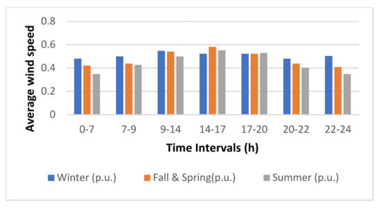 As the output power of the wind turbine has a direct relationship with the wind speed, the numbers of the vertical axis of the curve in Figure 2 could be scaled per unit and generalized to the capacity needed in a custom power network. Also, the wind speed could be determined for every time interval in each season of a year. Figure 3 shows the scaled number for the time intervals, the same as that considered for the load demand. It should be noted that the wind profile for a specific region will be constant for every year and will not be changed during the period of study.