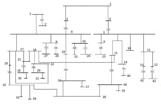 To evaluate the performance of the proposed method, an IEEE std 39 network is selected as the test system. This sample network is a distribution system with 42 buses. Busses 1 to 4 have a voltage level of 69 kV, busses 5 to 22 have a voltage level of 13.8 kV, busses 23 to 26 have a voltage level of 2.4 kV, and the other busses have a voltage level of 480 V. The external grid is connected to one of the 69 kV busses, and all of the loads are connected to the 480 V and 2.4 kV busses. It is assumed that the DGs are to be placed at the 13.8 kV and 2.4 kV busses. The general topology of the network is shown in Figure 4. The specifications of the lines can be found in [15].