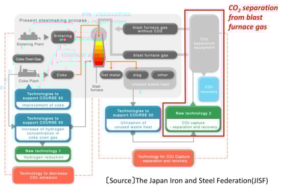 - Ujisawa, Y.; Tonomura, S.; Ishiwata, N.; Nabeshima, Y.; Saito, K. CO2 breakthrough program by COURSE50 in Japanese steel industry sector. In Energy Technology Roadmaps of Japan: Future Energy Systems Based on Feasible Technologies Beyond 2030; Springer: Berlin, Germany, 2016; pp. 431–439. [Google Scholar]