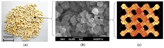 Zeolite 13X adsorbent pellets ((a) Appearance of pellets; (b) Crystallites of Zeolite 13X observed by SEM; (c) Framework of Zeolite 13X from open access database of Structure Commission of the International Zeolite Association (IZA-SC)).