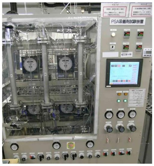 To prepare for the pilot tests, fresh adsorbent pellets were inserted into the adsorbers. A wire net and a perforated plate were initially placed at the bottom of the adsorber to support the adsorbent pellets after packing. After inserting 240 kg of adsorbent pellets in each adsorber, the packing density was calculated by dividing the weight of the packed adsorbent pellets by the measured packing volume. Figure 13 shows the appearance of the adsorbent pellets, together with scales indicating their sizes. Table 8 shows the measured size of the adsorbent pellets for 50 randomly selected pellets and their measured packing densities. The d = 3.0 mm larger adsorbent pellet has a smaller aspect ratio L/d than that of the d = 1.5 mm smaller ones. However, the results in Table 8 show that the effect of the shape difference on the packing densities of these adsorbent pellets were negligibly small. There are many reports on investigations of the packing densities of solid particles having size differences based various measurement methods or DEM packing simulations [,,]. The size difference of the particles and its distribution generally cause some increase in the packing density owing to the effect of increased volumetric occupancy by smaller particles. The measured packing density in Table 8 shows that the size difference of these two types of adsorbent pellets is small enough to avoid a change of packing density, meaning that the adsorber size remains stable if the d = 3.0 mm larger adsorbent pellets are packed instead of the d = 1.5 mm smaller ones. The crushing strengths of the pellets were measured with a grain rigidity digital tester (WPFHT-20N, Shiro Industry Co., Osaka, Japan). The value was the average of the measured crushing load of 25 randomly selected samples. The crushing strength of the d = 3.0 mm larger pellet was about 2 times higher than that of the d = 1.5 mm smaller pellet, which was sufficient for practical utilization in a large-scale PSA process. After packing the adsorbent pellets in each adsorber, another wire net and ceramic balls were placed on the top of the adsorbent packed bed with the aims of both reducing the dead volume and preventing pellet fluidization during PSA operation.