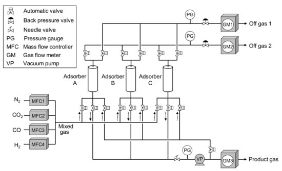 Figure 3 shows the laboratory-scale CO2-PSA equipment having three adsorbers. The equipment specifications and operation conditions are listed in Table 3. Figure 4 shows a schematic diagram of the experimental setup of this laboratory-scale CO2-PSA, which consists of individual feed gas lines (N2, CO2, CO, H2) with mass flow controllers, three adsorbers consisting of SUS columns having a 40 mm inner diameter and 300 mm height, a backpressure valve to stabilize the adsorption pressure, a vacuum pump to control the desorption pressure, and gas flow meters to calculate the mass balance. Each adsorber was packed with 120 g of fresh adsorbent pellets. Standard gases having purity of more than 99.95% were prepared with gas cylinders and provided through the regulators. The mass flow controllers were calibrated previously to create a mixed gas of various feed gas compositions with high precision. The gas evacuation rate of the vacuum pump was adjusted by the needle valve of the vacuum pump suction line to achieve the target minimum gas pressure in the gas desorption step. The automatic valves were controlled by programmed patterns that were set previously on a control panel. The feed gas flow was controlled to a constant rate by the mass flow controllers. The gas adsorption pressure during the PSA cycle was adjusted to the value in Table 3 by adjusting the backpressure valve of the off-gas line. The gas flow rate was calculated by dividing the measured gas flow amount in one PSA cycle by the cycle time. The accumulated gas flow volume was measured by an integrating gas flow meter (model DC-1, Shinagawa, Tokyo, Japan). The gas recovered during one PSA cycle was collected in a gas bag, and its composition was measured by gas chromatography (GL-4000, GL Sciences, Tokyo, Japan).