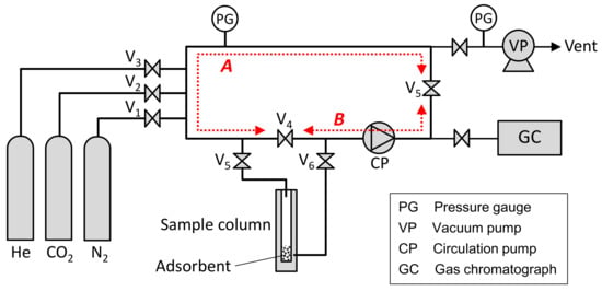 To clarify the effect of the adsorbent size on the CO2 adsorption rate of Zeolite 13X adsorbent pellets, the CO2 adsorption rate was measured by using a BELSORP-VC (MicrotracBEL Corp., Osaka, Japan). Figure 5 shows a schematic drawing of this experimental apparatus. The CO2, N2, and He (purity: >99.95%) gas cylinders were connected individually to the inlet gas lines. As the first step of this measurement, the fresh adsorbent pellets were regenerated in a sample column at 473 K in a vacuum state for 2 h. After cooling the sample, the whole system was evacuated and the dead volume of the sample column was measured by He gas expansion. Next, the system was evacuated again, and the 50% CO2–50% N2 mixed gas was prepared by using a pre-column having a circulation pump and two zones A, B with known volumes. As the first step in the gas mixing process, these A and B zones were filled with a primary gas at a specific pressure. The B zone was then isolated by shutting the V4, V5 valves, and the A zone was evacuated by a vacuum pump. Subsequently, a secondary gas was introduced into the A zone at the pressure necessary to obtain the target gas mixing rate and initial gas pressure. The A zone filled with the secondary gas was connected to the B zone filled with the primary gas by opening the V4, V5 valves, and the gases were mixed by the circulation pump. The gas mixing time by the circulation pump necessary to ensure sample uniformity was defined automatically. After preparing the CO2–N2 mixed gas, the gas was introduced into a stainless sample column having a 6 mm diameter and 100 mm length containing 1 g of adsorbent pellets by opening the V5, V6 valves at 298 K under thermostatic control. The pressure variation after gas introduction was measured every second until it reached to the equilibrium state. This system is also equipped a gas chromatograph that can measure the gas concentration within about 30 s, but the chromatograph was not used in this measurement because the measurement time was not sufficient to follow the variation of the gas adsorption amount in 1 s units.