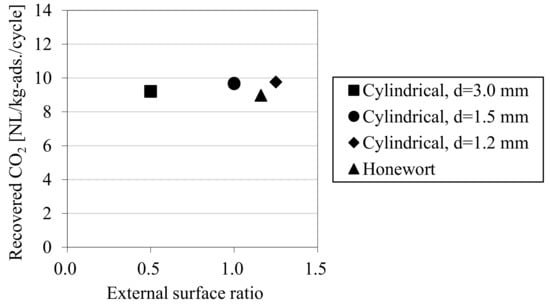 Figure 6 shows the results of the laboratory-scale CO2-PSA experiment. The horizontal axis shows the pellet external surface ratio in Table 1, and the vertical axis shows the amount of CO2 recovered in one PSA cycle. The results show that the external shape of the adsorbent pellet has little relationship with the amount of CO2 recovery at this laboratory scale. The result of the honewort-shape pellets, which was originally expected to improve PSA performance as a result of its enhanced external surface area, was also on the same level as the other adsorbent pellets. From these results, it was estimated that the gas diffusion rate from the surface to the center of the adsorbent pellet was high enough that the effect of the external pellet size could be neglected, and this high diffusion rate was attributable to the larger macro-pores inside the pellets.