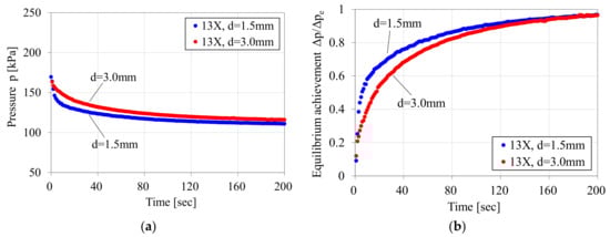 The Figure 7a shows the pressure variation after introducing the mixed gas into the sample column of Figure 5. In the results with the d = 1.5 mm adsorbent pellets, a rapid pressure decrease was observed within a few seconds after gas introduction. However, the pressure decrease within the same time range was relatively small in the case of the d = 3.0 mm adsorbent pellets. The Figure 7b shows the variation of equilibrium achievement, which is defined as the ratio of the maximum pressure decrease after reaching equilibrium ∆pe and the temporal pressure decrease ∆p. The effect of the adsorbent size could be observed in the early stage of gas adsorption, as the gradient of the graph of the d = 1.5 mm adsorbent pellets was much larger than that of d = 3.0 mm adsorbent pellets. The gradient of equilibrium achievement became smaller as it approached 1.0 for the equilibrium state. The retention time for equilibrium achievement varied depending on the type of adsorbent and the adsorbed gas species.